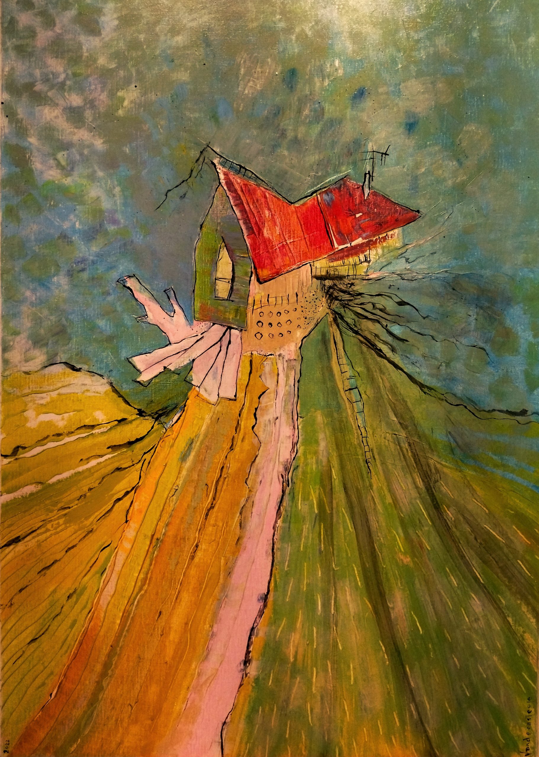 Cabane « toile » n°4 __Juillet _ Aout __2022 __92 cm x 65 cm . Création de Serge Vandecasteele . Prix : 1200 euros .